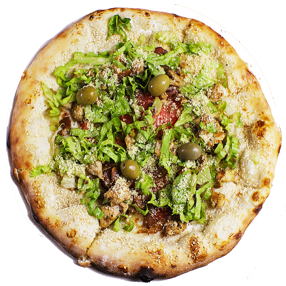 Pavlaka, sir, piletina, slanina, parmezan, masline, zelena salata, paradajz,susam, dressing.
