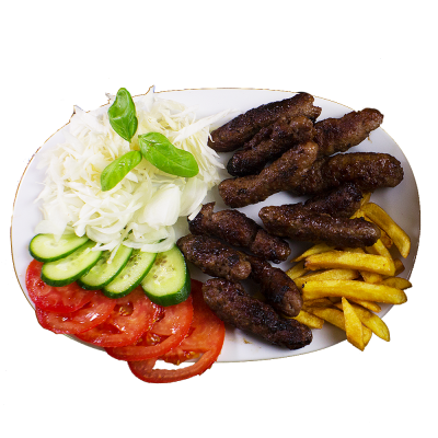 Porcija je ukupno 300 grama, a uz porciju idu gratis pomfrit, salata i lepinja. Meso je punjeno sa sirom i šunkom.